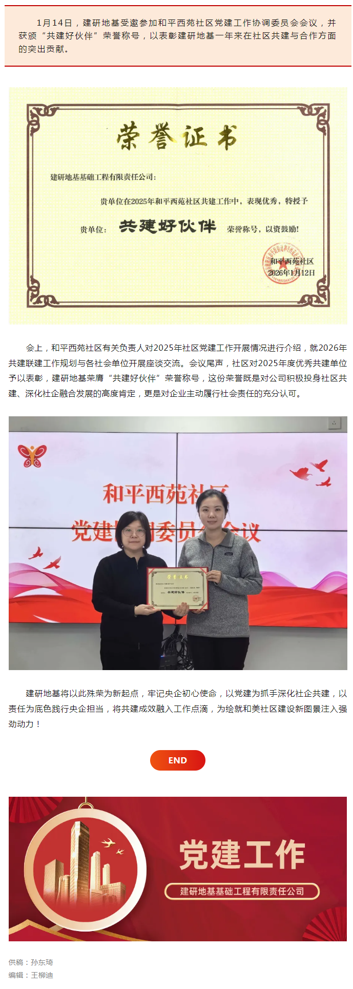 党建引领聚合力 社区共建谱新篇 | 建研地基荣膺和平西苑社区“共建好伙伴”荣誉称号