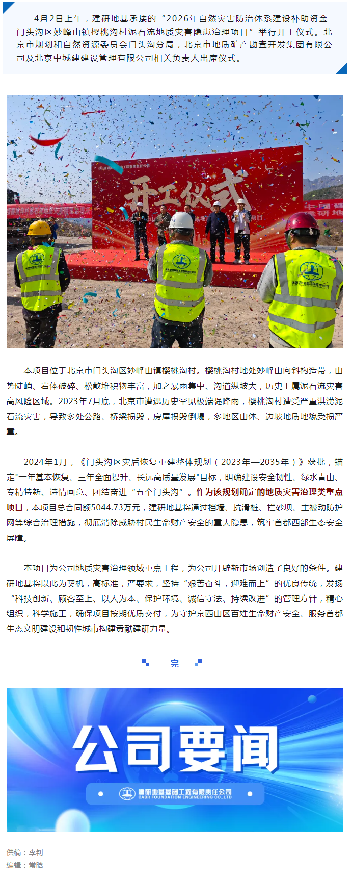 地灾治理领域新突破 服务首都生态安全大局 | 建研地基妙峰山镇樱桃沟村泥石流地质灾隐患害治理项目举行开工仪式