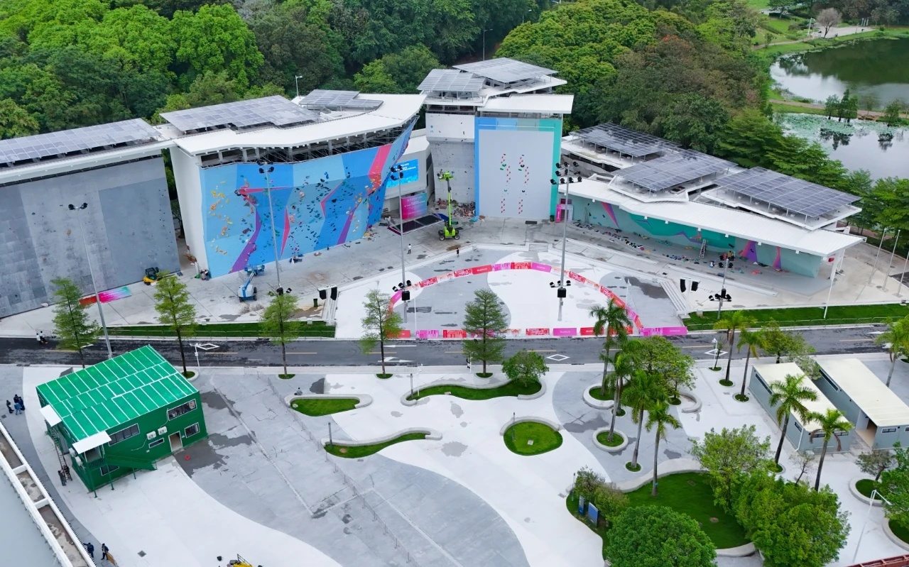 广州大学城体育中心攀岩场位于广州市番禺区,项目维修改造建筑面积为3720.3平米,承办十五运会竞体项目攀岩赛事。