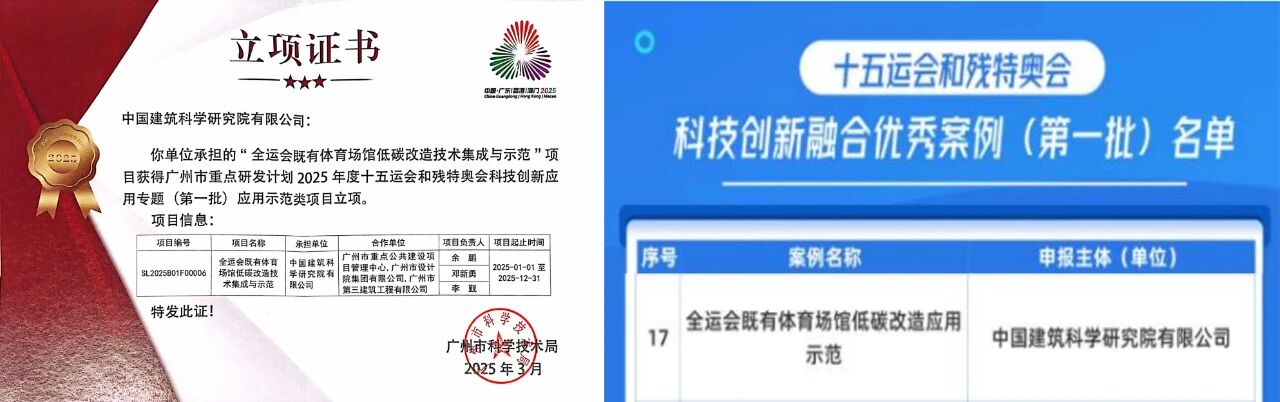 中国建研院天津分院立足岭南地区气候特征,充分结合各场馆自身特点和需求,深入开展低碳改造课题研究,承担完成的“全运会既有体育场馆低碳改造技术集成与示范”入选广州市重点研发计划2025年度十五运会和残特奥会科技创新应用专题(第一批)应用示范类项目,获十五运会和残特奥会科技创新融合优秀案例。