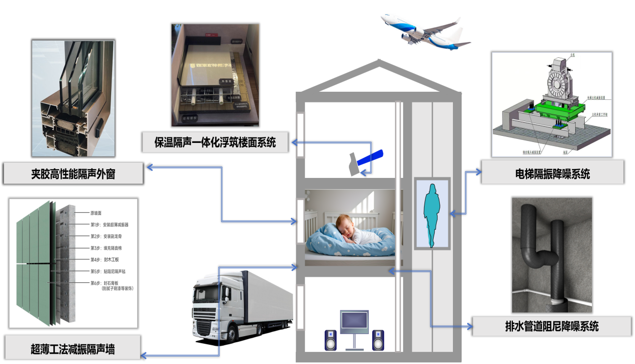 宁静住宅评价标准全方位提升了住宅声品质要求,需要高性能隔声产品助力实现宁静住宅项目落地。宁静住宅建设体系采取进口产品国产化替代等方式,对高性能楼板隔声垫、轻质高隔声墙体、高隔声外窗、电梯隔振减噪装置、排水管降噪装置进行产品隔声性能提升研发,形成了适配宁静住宅各级别隔声性能要求的系列化产品。