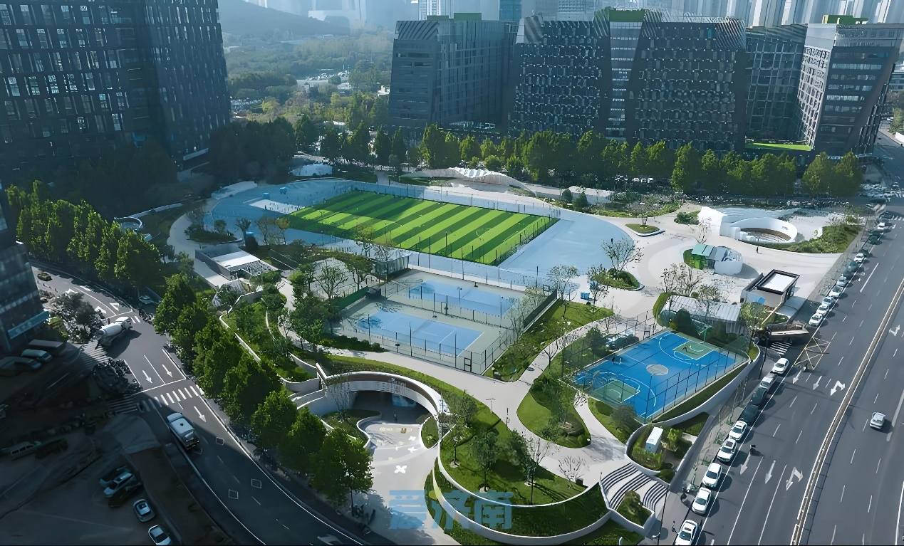 舜泰广场智慧停车项目是集停车与公共运动设施为一体的综合功能建筑。项目场地原为济南市舜泰商务办公园区中央的公共运动场地,为解决片区停车容量不足、道路交通拥堵、环境安全度差、市容品质低下等问题,在运动场地下方建设地下集中式停车设施,地上还建运动设施及城市公共活动空间。