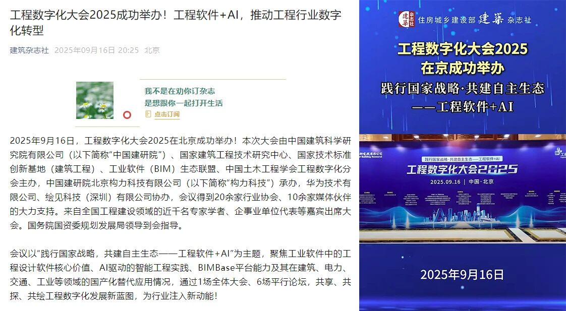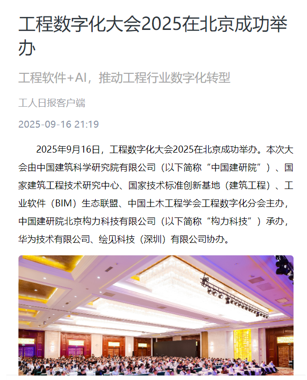 9月16日,工程数字化大会2025在北京成功举办。人民网、人民日报新安全、光明日报、科技日报、工人日报、中国青年报、北京日报、建筑杂志社、中国工业报、中国能源新闻网、中国化工报等10余家权威媒体对会议进行了深度报道。