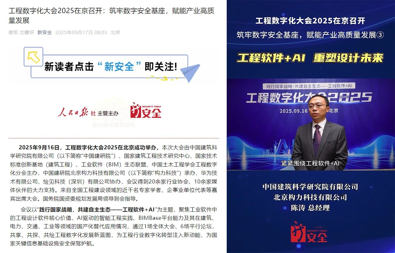 人民日报新安全对工程数字化大会2025全程进行报道,通过视频专访中国建研院构力科技相关负责人,展现其推动“工程软件+AI”创新、实现工业软件自主可控、保障国家重要基础设施与重大工程数据安全的具体举措。