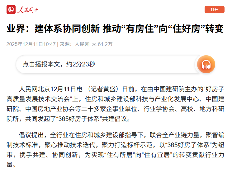 倡议提出,全行业在住房和城乡建设部指导下,联合全产业链力量,聚智编制技术标准,聚心推动技术迭代,聚力打造标杆示范,以“365好房子体系”为纽带,携手共建、协同创新,为实现“住有所居”向“住有宜居”的转变贡献行业力量。